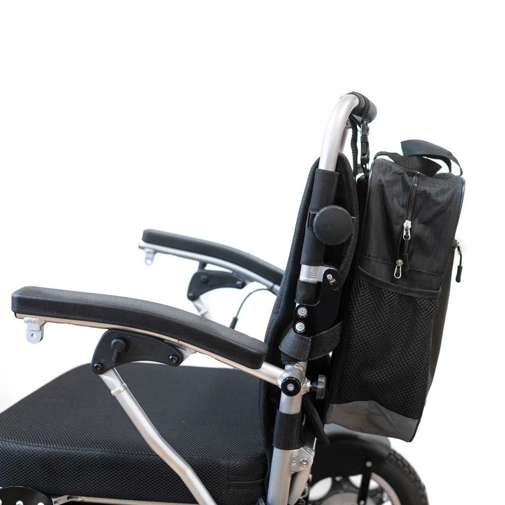 Experience the perfect blend of spaciousness and durability with our Backrest Bag, designed to fit perfectly with all Eloflex models. This versatile bag is mounted with straps around the backrest of the electric wheelchair and then effortlessly removed or put back on with quick-release buckles and VELCRO® straps. In addition to the large main compartment, the bag has a spacious front pocket and handy mesh side pockets, offering plenty of storage options for your belongings. The Backrest Bag is equipped with reflective tape for increased safety. It accomodates16 L and is 39 cm high, 37 cm wide and 12 cm deep.