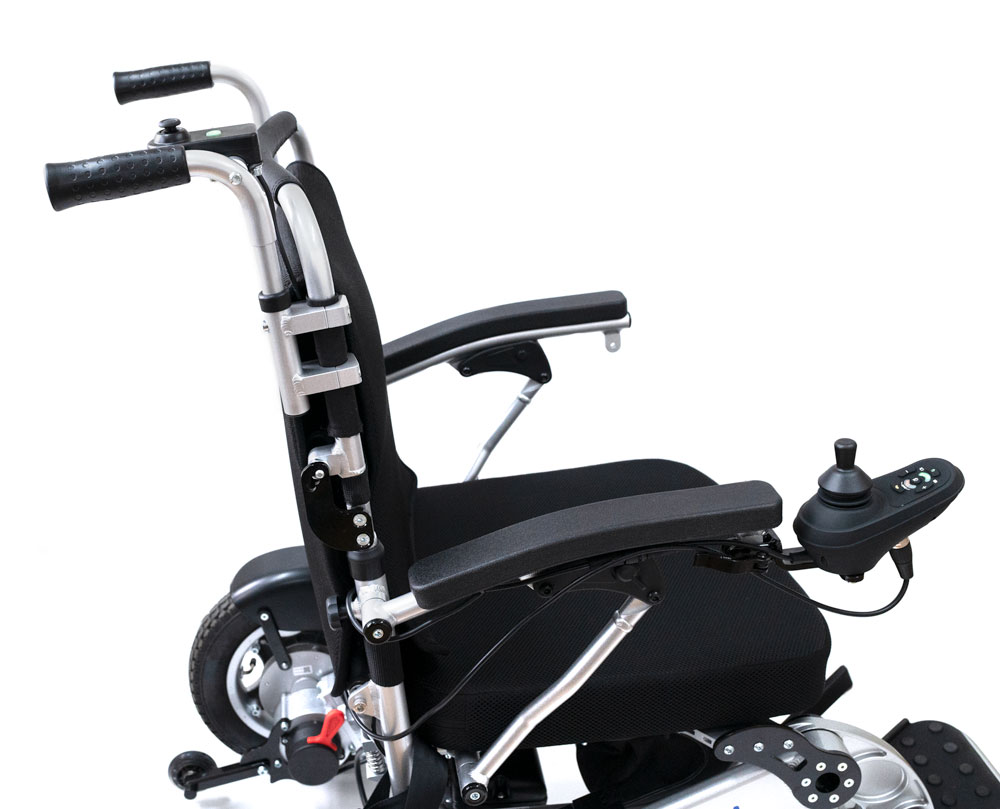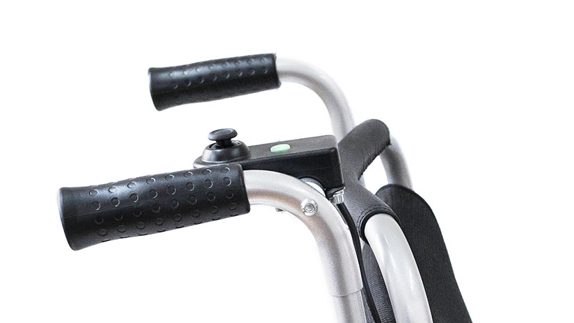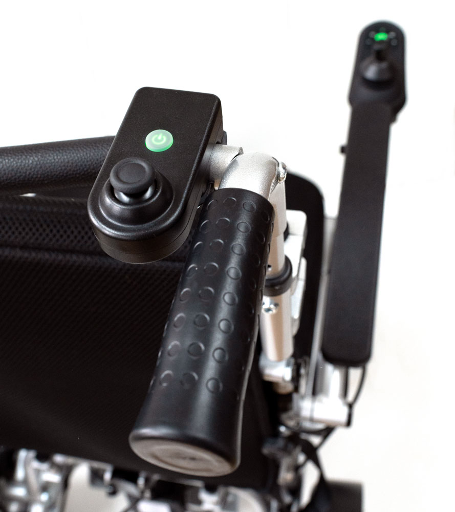 Eloflex Model A is a secure, high-precision attendant control system specifically designed for Eloflex power wheelchairs. When the attendant control mode is activated, the person walking behind the electric wheelchair can safely and accurately operate it. Whether you’re accompanied by a companion or a caregiver, controlling the wheelchair’s movement is made easy with an arm and bracket located at the rear of the chair. The arm features a new joystick, two handles and a thumb joystick. The two handles allow the person walking behind to intuitively sense the chair’s movements and operate the thumb joystick with exceptional precision.