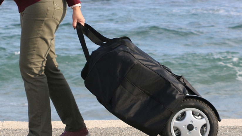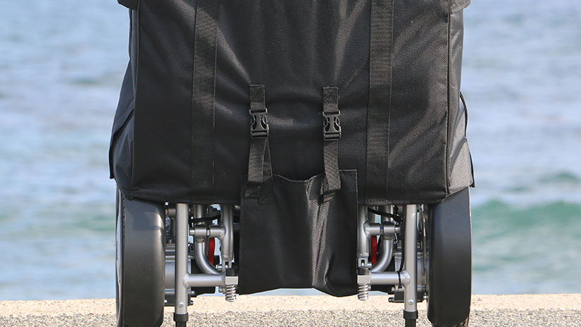 At the bottom, the case closes with two strong buckles. The design enables the bag to be lifted by its handles with the chair inside, without the risk of it opening and the chair falling out. This is especially relevant when checking in your Eloflex before traveling by air, as airport staff often lift your Eloflex by the handle when loading it on to the plane.