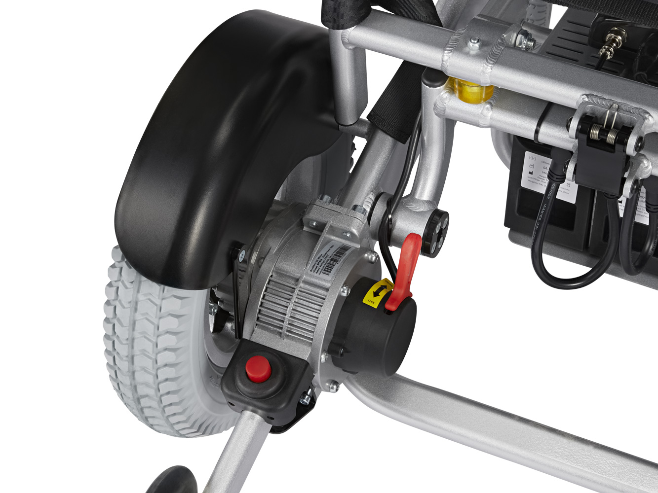 Packed with features like dual suspension and air-filled tires all around, this model is ideal for those living in rural areas. Adjustable armrests, an extra-large footrest, a comfort cushion and space for up to three batteries are just some of the model's highlights.