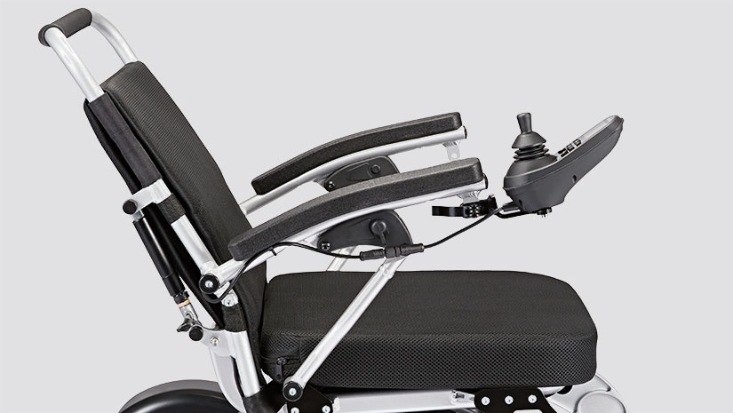 Our cleverly designed joystick mount brings you closer to the edge of tables, enhancing accessibility. The footrest conveniently folds beneath the seat, and large air-inflated rear wheels ensure a comfortable ride, even on uneven terrain. With dual batteries as standard and room for a third battery, your range extends up to 45 km, offering 7.5 hours of use on a single charge.