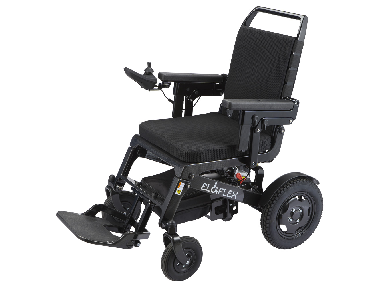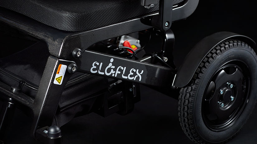 Eloflex Z stands as the most exclusive foldable power wheelchair available, both in our own range and on the market in general. This model is tailored for those who want the “best of the best” and hold their assistive device to the highest standards. Crafted from carbon fiber, the frame ensures an exceptionally low weight of only 23kg. Its format is compact, flexible, and foldable.